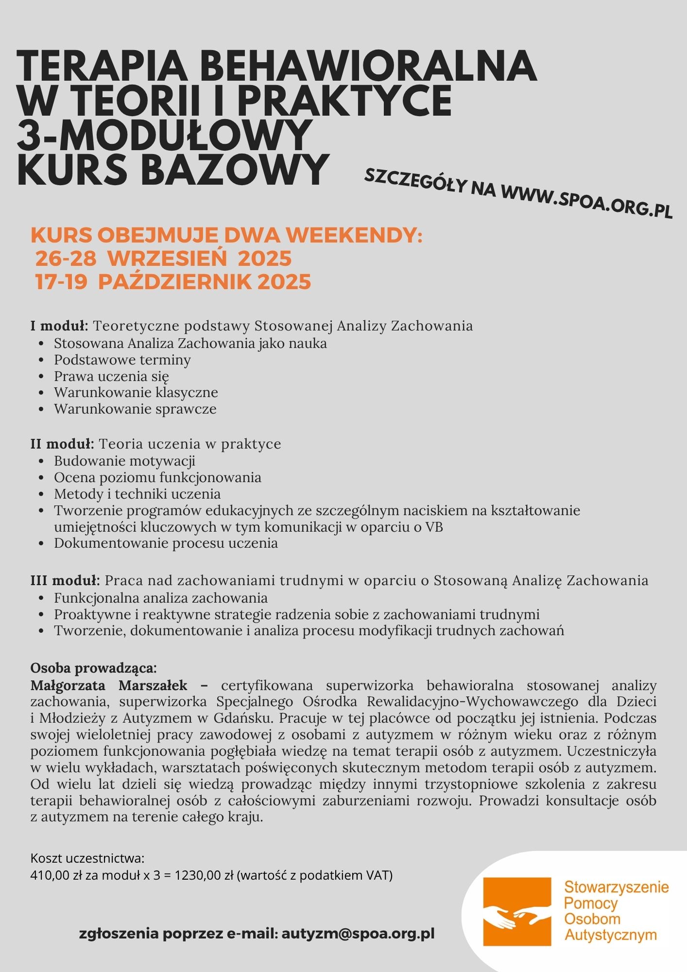 • TRZY-MODUŁOWY KURS BAZOWY DOTYCZĄCY TERAPII BEHAWIORALNEJ W TEORII I PRAKTYCE, PRZEZNACZONY DLA NAUCZYCIELI, TERAPEUTÓW I OSÓB PRACUJĄCYCH Z DZIEĆMI I MŁODZIEŻĄ Z AUTYZMEM