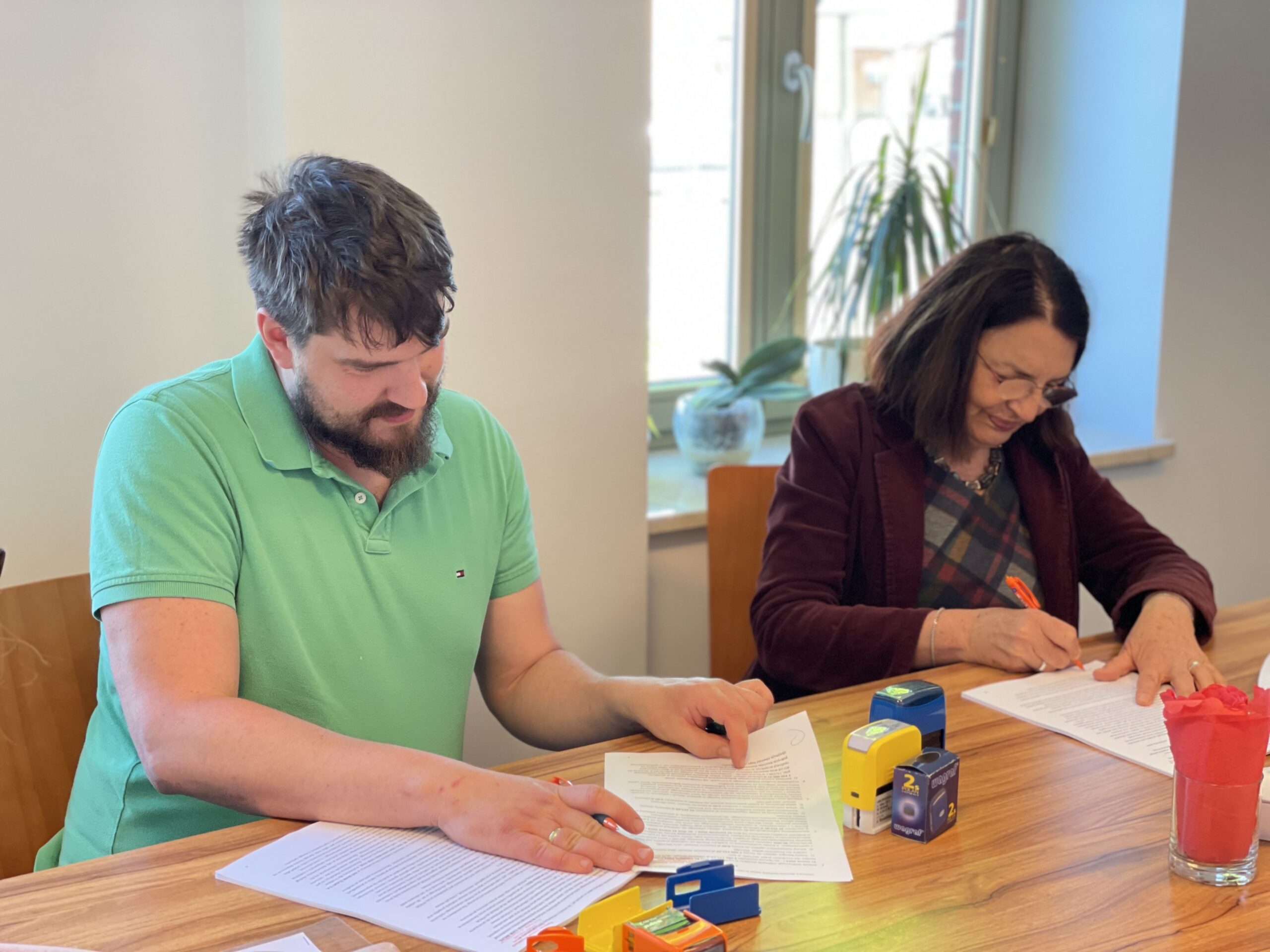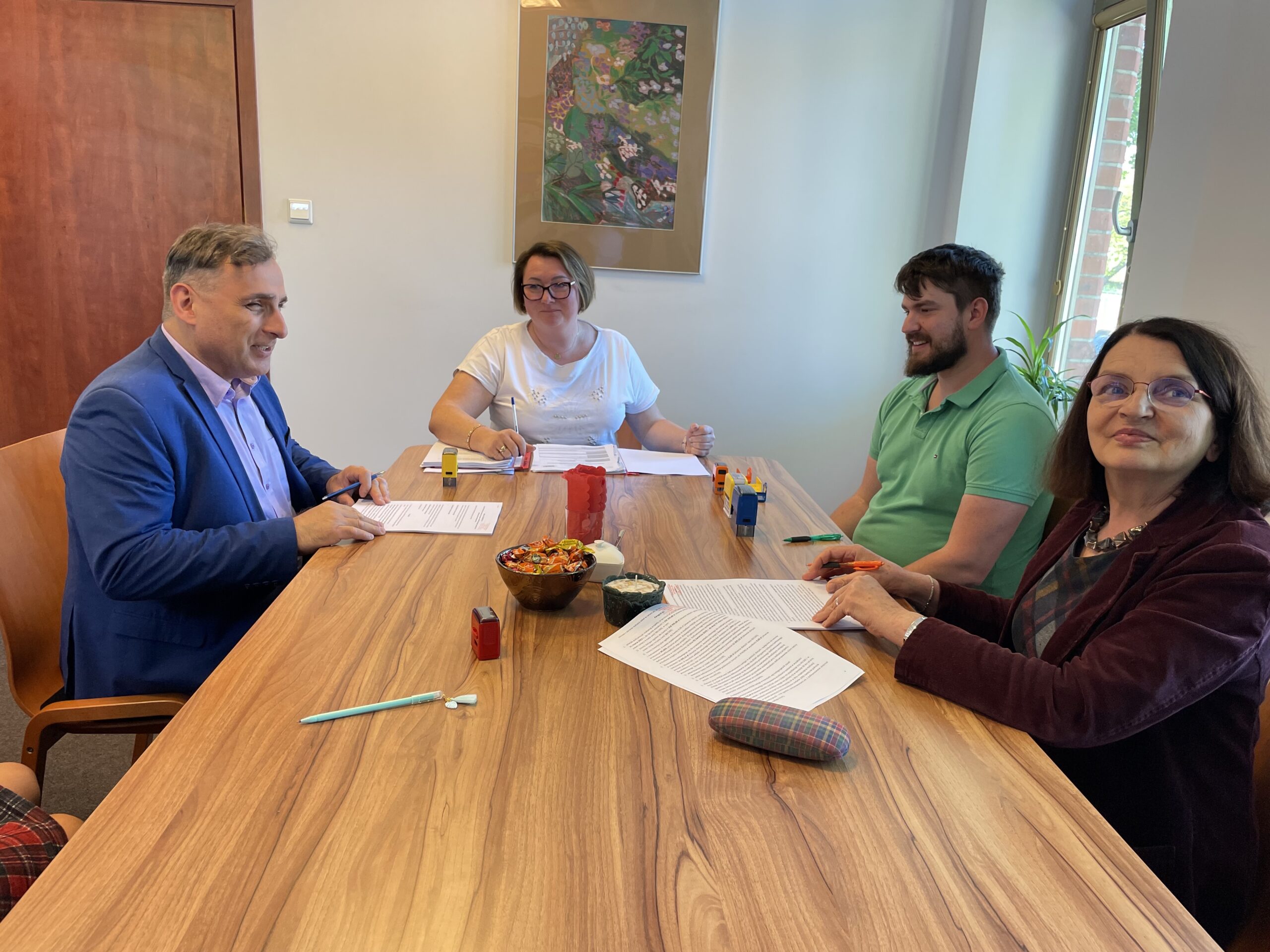 Zdjęcia z zawarcia umowy z PFRON: od prawej Małgorzata Rybicka przewodnicząca Stowarzyszenia oraz Kacper Ptaszek – sekretarz Stowarzyszenia, po lewej stronie Dariusz Majorek – dyrektor PFRON Oddział Pomorski.