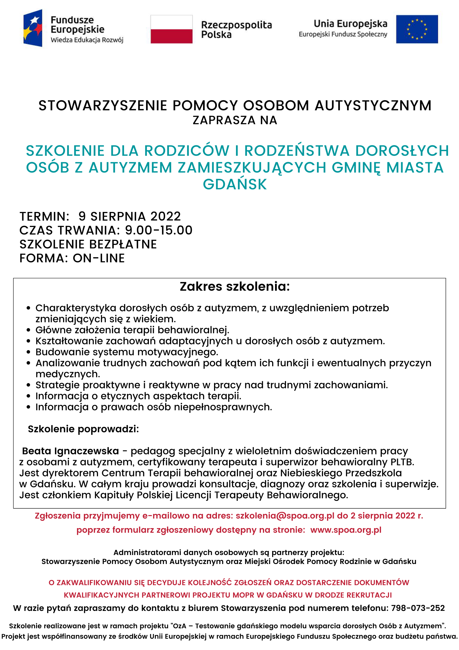 Zgłoszenia przyjmujemy e-mailowo na adres: szkolenia@spoa.org.pl do 2 sierpnia 2022 r.