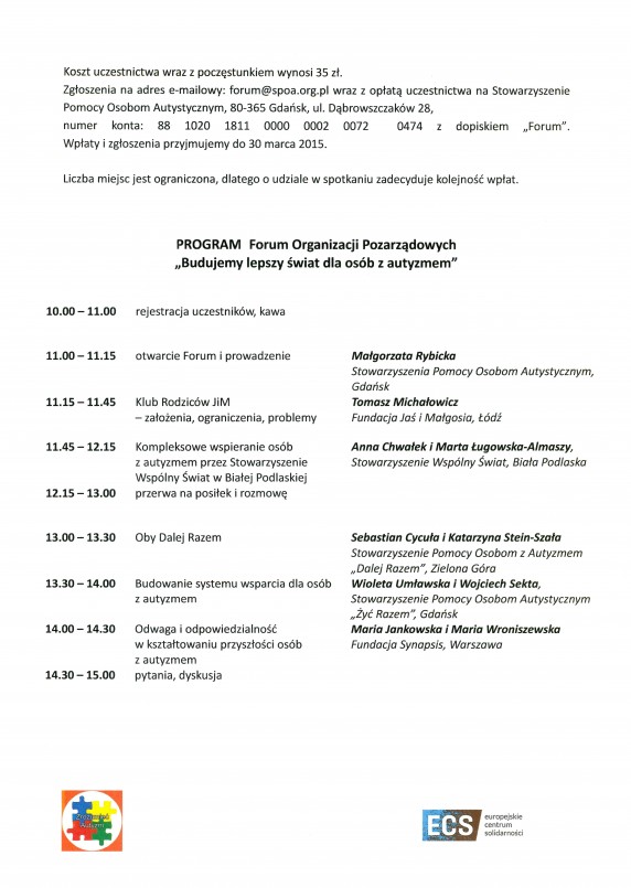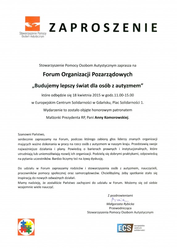 W dniu 18 kwietnia 2015 r. w Europejskim Centrum Solidarności w Gdańsku odbędzie się Forum Organizacji Pozarządowych pt. „Budujemy lepszy Świat dla osób z autyzmem” . Poniżej zamieszczamy zaproszenie wraz z programem Forum. Zapraszamy do udziału wszystkich zainteresowanych.