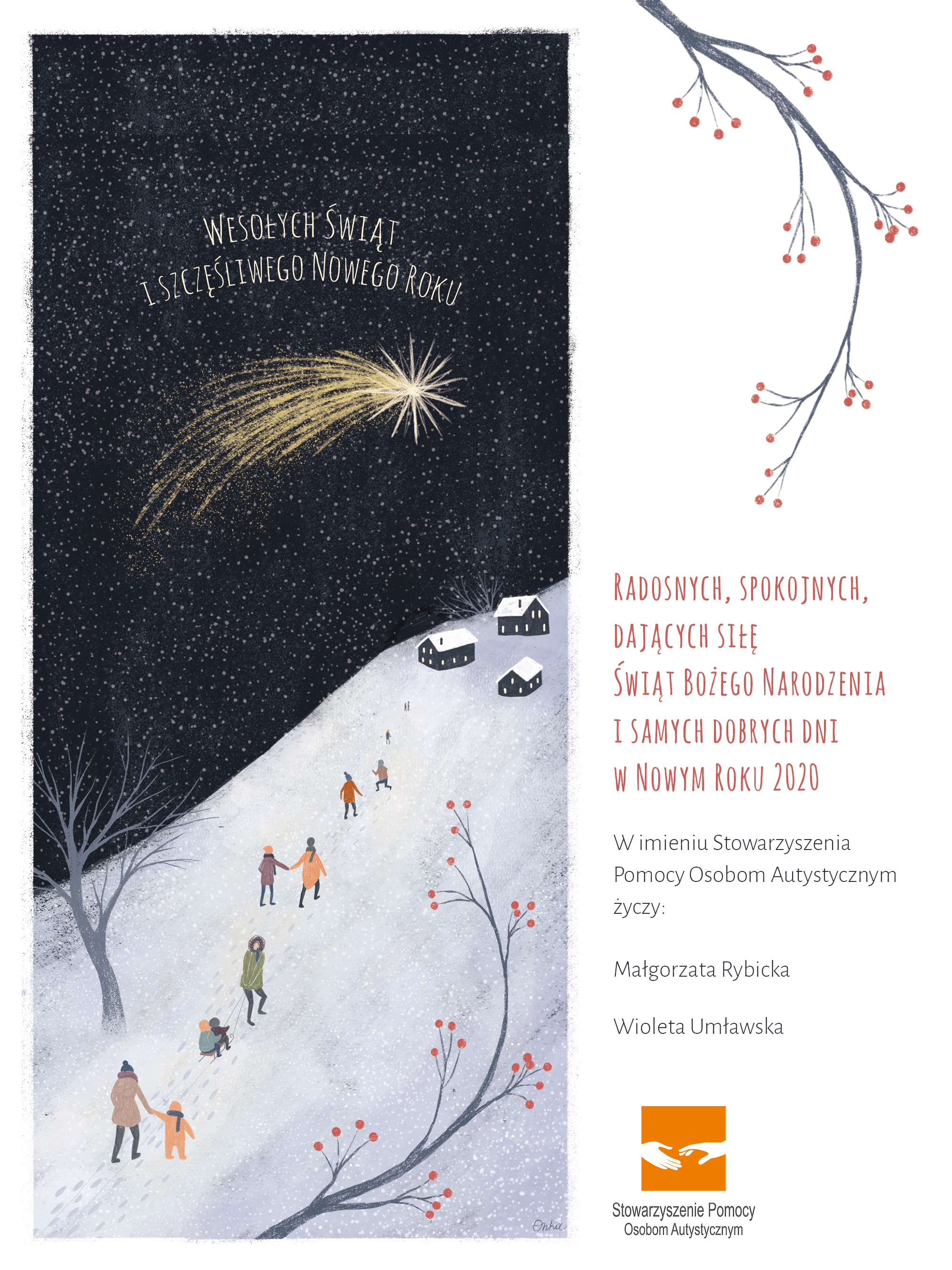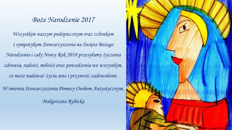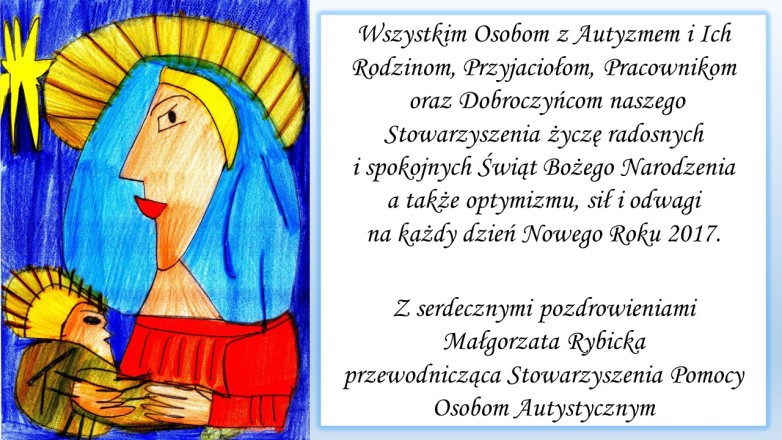 Na Nowy Rok życzenia wszelkiej pomyślności składamy członkom, przyjaciołom i dobroczyńcom Stowarzyszenia Pomocy Osobom Autystycznym. Niech ten rok otworzy nam wszystkim nowe szanse, perspektywy i możliwości. Niech będzie czasem twórczej, przynoszącej dobro pracy.