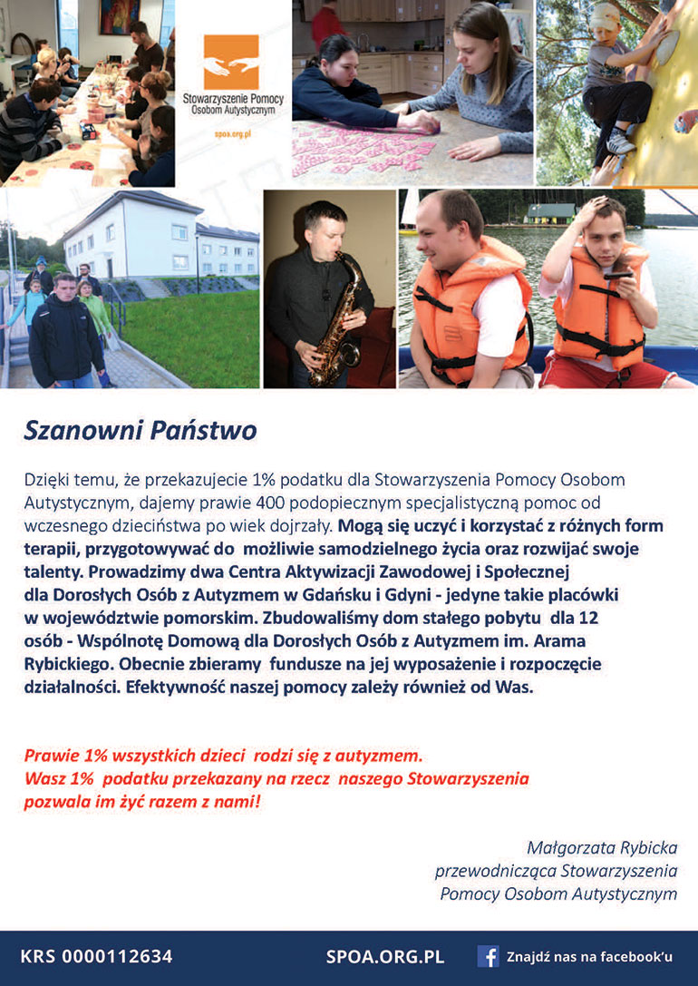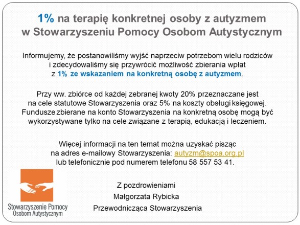 Nowy Rok jest także inauguracją akcji dokonywania odpisów 1% od podatku dochodowego. Zwracamy się do Was z serdeczną prośbą, żebyście zechcieli przekazać Wasz 1% na nasze Stowarzyszenie. Właśnie dzięki niemu możemy nadal kontynuować naszą misję pomocy osobom z autyzmem.