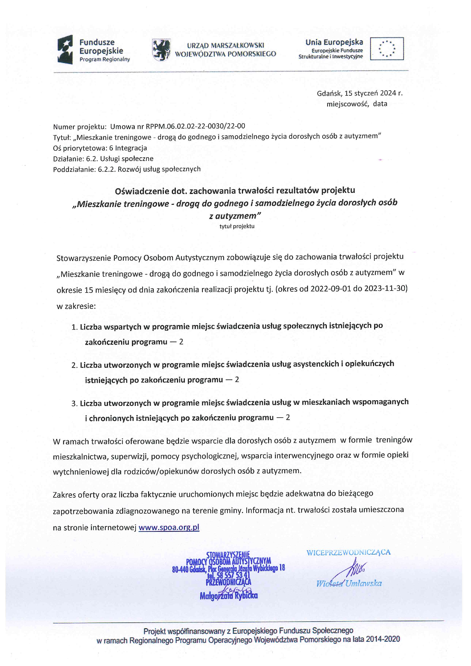 Zakłada się, że w okresie realizacji projektu, każda z 19 osób skorzysta w zależności od potrzeb z:treningów mieszkalnictwa, które realizowane będą w tygodniu lub usług wytchnieniowych realizowanych głownie w weekendy. Osoby te będą bezpośrednio wspierane przez trenerów samodzielności, przewiduje się również dodatkowe wsparcie w postaci superwizji, pomocy psychologicznej oraz trenera interwencyjnego w godz. nocnych. Przeprowadzony zostanie również remont, adaptacja i wyposażenie mieszkania, które będzie zrealizowane zgodnie z ideą projektowania uniwersalnego dostosowanego do potrzeb OzA. W ramach projektu powstanie miejsce usług społecznych wspierające 19 OzA. Na terenie woj. pomorskiego nie istnieją mieszkania treningowe, ani wspomagane dedykowane tej szczególnej grupie osób. Najważniejszy efekt realizacji projektu- nabycie przez OzA większej samodzielności i nowych umiejętności oraz regeneracja sił rodzin w czasie realizacji projektu i w okresie zapewniania trwałości przez min. 12 m-cy po zakończeniu finansowania z projektu.