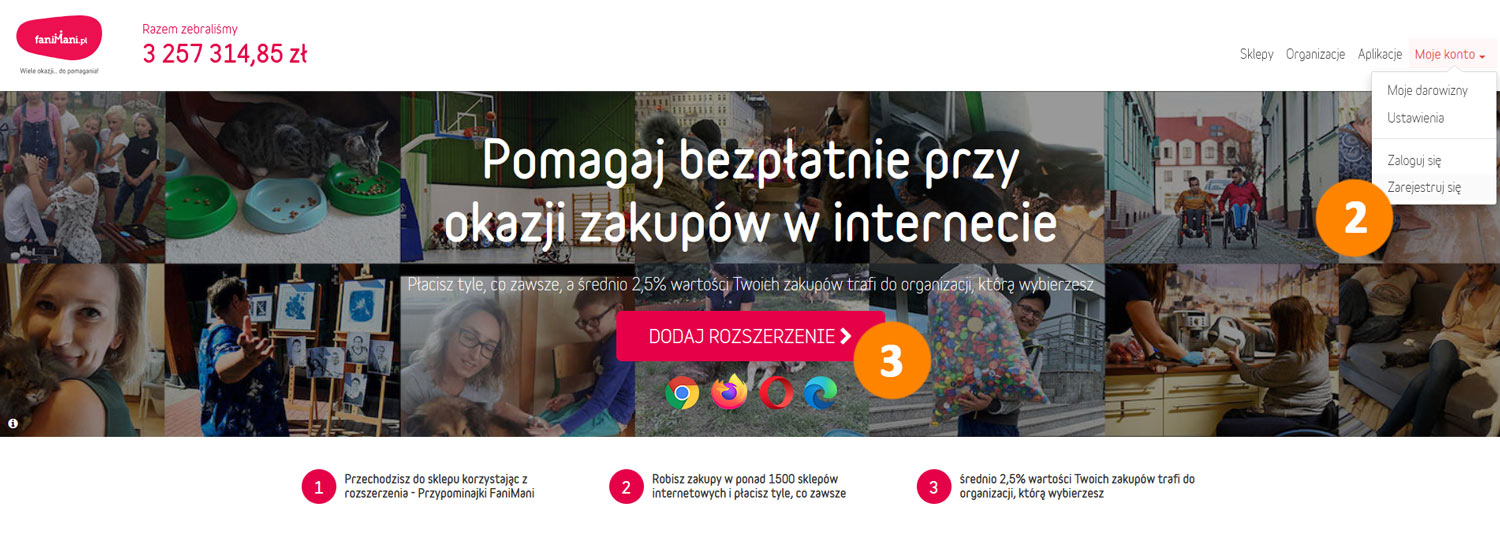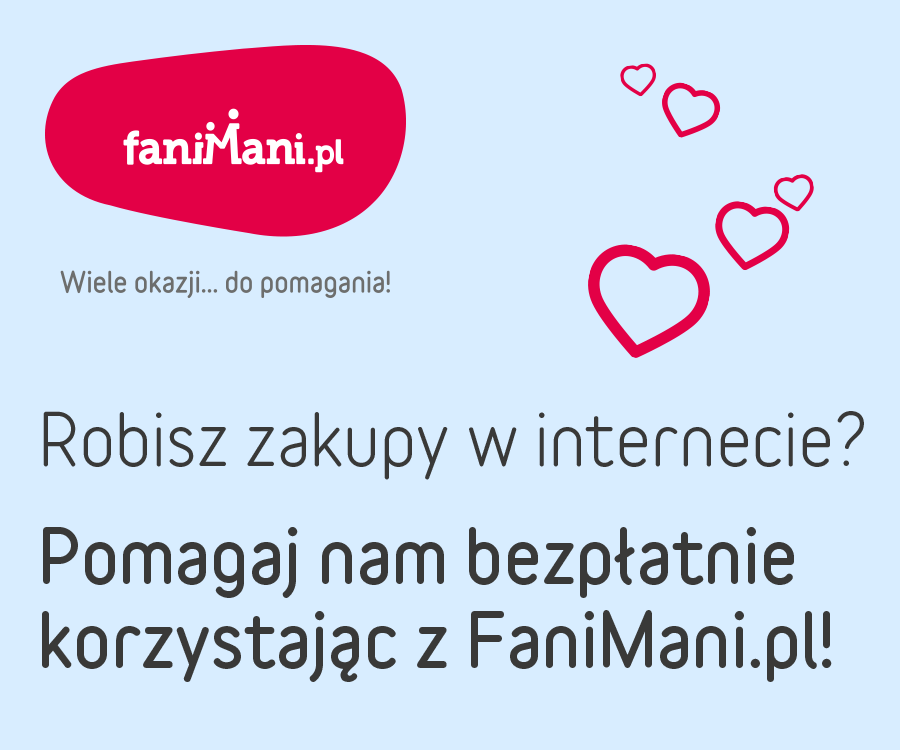 Wystarczy przejść 4 proste kroki, aby regularnie przekazywać dla nas darowiznę przez platformę fanimani.pl (jest ona całkowicie bezpieczna – korzysta z niej już ponad 6 tysięcy organizacji pozarządowych w Polsce). Dołączenie zabiera 5 min. Z każdego zakupu w wybranych sklepach (ponad 1500 m.in allegro.pl czy empik.com) średnio 2,5% trafi do naszej organizacji.